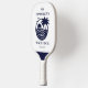 Serve in style with this personalized coastal beach pickleball paddle, designed for both performance and personality. This chic design features a palm tree and the sun rising above the ocean in elegant navy blue and white, set against a crisp white background on the front, and your family name and year established. The back showcases classic nautical blue and white stripes, personalized with your family monogram—making it the perfect beach housewarming gift. Coastal, stylish, and sea-inspired, this paddle brings a touch of the shore to every game.