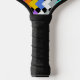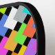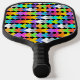 Este remo de pickleball tiene un diseño geométrico de diamantes de neón que se superponen en un campo de negro.