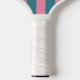 Hay rayas rosas y azules en esta paleta de pickleball. En la parte superior, hay un texto para mostrar que puede editar el nombre del destinatario. Esta paleta de pickleball tiene una paleta de colores estilo años 70 retro que incluye rosa y azul mullidos.
