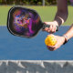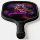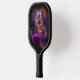 Una pala de pellebol con una imagen de una sirena de neón guerrero contra un fondo negro.