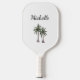 Elegante remo de pickleball personalizado, con un diseño de palmeras tropicales. La escritura elegante en negro se puede personalizar con tu propio texto. Un accesorio inspirado en la playa para tu juego favorito.