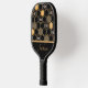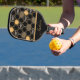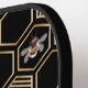 Este diseño contemporáneo presenta un patrón geométrico de colmena dorada, abejorros y un fondo de color negro.