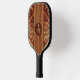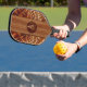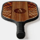 Un magnífico diseño con una banda central de madera clara rodeada de un patrón triangular redondeado en madera tallada y artesanal con contrastes de madera. En el centro, el monograma se muestra en círculo con magníficas letras entrelazadas como grabadas en la madera. Accesorio muy refinado, esta paleta le dará un toque decorativo de moda a su equipo de pickleball.