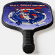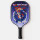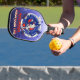 Astronauta azul y rojo personalizada flotando en el espacio rodeado de planetas, estrellas, OVNIs y la galaxia.
