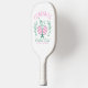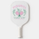 Este remo de pickleball tiene una imagen de arte de línea rosa y verde de remo de pickleball y un cristal de martini rodeado de ramas de laurel con la frase "Club de cócteles de bolas de bolas de bolas de bolas, por favor, hágalo con responsabilidad". Los colores utilizados incluyen el verde y el rosa. La parte posterior tiene rayas rosas y blancas que se coordinan con el diseño de la parte delantera.