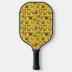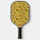 Esta paleta de pickleball tiene un diseño moderno de mediados de siglo de rectángulos redondeados en tonos verdes y marrones con agujeros en un campo de oro. Si te gusta el diseño pero prefieres colores diferentes, envíame un mensaje.