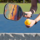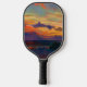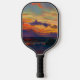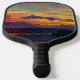 Un diseño artístico de una hermosa puesta de sol también muestra rocas, playa y un hombre pescando.