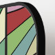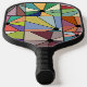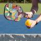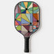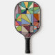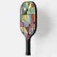 Este remo de pickleball tiene un diseño abstracto hecho de nueve cuadrados con un círculo y "rayos" saliendo del círculo en muchos colores diferentes.