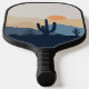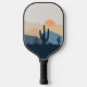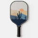 Ilustracion de desierto mexicano al amanecer con sol, montañas y cactus decoración en tonos azul marino, naranja, azul y beige sobre fondo gris pastel.