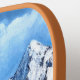 Un remo de pickleball con una hermosa escena de invierno, incluyendo montañas cubiertas de nieve, verduras y una cabaña rústica. La imagen y el texto se pueden personalizar. Obra de arte original de W.B.