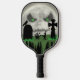 La parte delantera de este remo de pickleball tiene un diseño con una espeluznante luna llena sobre un cementerio. En la parte trasera hay una burla que muestra tu lado competitivo.