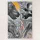 This puzzle features four digitally hand-drawn, human-made illustrative portraits of prehistoric life in a pop art or comic style - dinosaurs from the Cretaceous including Tyrannosaurus, Triceratops, Edmontosaurus, and Infernodrakon (a large pterosaur). Splashes of meteorological and astronomical color add some vibrancy to the background.