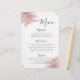 Un menú moderno de un mínimo de color rosa con el popular tema de la vegetación tropical de las palmeras para una boda playera o un fiesta tropical de destino. Las hojas de las palmeras tienen un efecto de Relieve metalizado falso oro rosa de malva muda. TOTALMENTE EDITABLE: Utilice la Herramienta de diseño para cambiar fuentes, organizar texto y seleccionar cualquier color de fondo para coordinar con su elegante boda en la playa. Visita nuestra tienda de diseño para ver los artículos a juego.