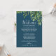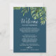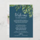 Estos itinerarios de cartas de bienvenida de la marina de palma silvestre y tarjetas de mapa son perfectos para una bolsa de bienvenida de boda de destino. El diseño presenta una exótica gama de hojas de plátano de palmera color agua verde, helechos, follaje, plantas botánicas y vegetación en un fondo azul marino para un ambiente de verano tropical. La parte delantera de la tarjeta incluye una carta de bienvenida y un itinerario. Incluya un mapa de su complejo turístico con las principales ubicaciones indicadas en la parte posterior de la tarjeta.