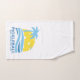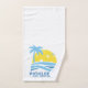 Una divertida toalla de mano de pickleball con un "sol" de bola enmarcado por una palmera tropical y olas oceánicas azules. Añade el texto de su personalizado a continuación: nombre del club, fecha/ubicación del fin de semana de pickleball, nombre del torneo, nombres de los jugadores, etc. Hace un regalo perfecto para cualquier jugador de pickleball - ideal para limpiarse el sudor en los días de juego de pickleball caliente.