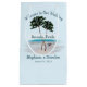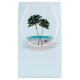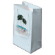 Boda de papel de las palmas entrelazadas con bolsos de bienvenida con texto. Bienvenidos a un evento de bodas de destino tropical con bolsas llenas de golosinas. Elija el tamaño pequeño o mediano sólo para la redacción que se ajuste. Las bolsas azul pálido con mangos de cuerda tienen palmeras y diseño de playa en la parte delantera. Personalizar el texto con la ubicación, los nombres de la novia y el novio y la fecha del boda.