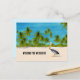 Pelican en una playa tropical, con bonitas vistas al océano y palmeras. Texto editable.