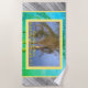 Días de verano calurosos y tropicales. Saludos desde Point Pleasant Beach, N.J. Personaliza para cualquier ciudad. Escrito en un texto amarillo soleado dentro de un marco rosa amarillo de tres palmeras con frondas que soplan en la brisa del océano con cielo azul bonito. El fondo está recubierto de baldosas azules y verdes. Los lados de la toalla tienen tablas de madera. Haga clic en personalizar para aumentar o reducir el tamaño de la fuente a ajustar. Guay para hombres o mujeres que aman las playas y paseos marítimos. ¡Compra más y ahorra. Diseño fotográfico original © TamiraZDesigns.