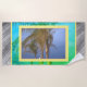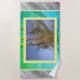 Días de verano calurosos y tropicales. Marco rosa amarillo de tres palmeras con frondas que soplan en la brisa del océano con cielo azul bonito. El fondo está recubierto de baldosas azules y verdes. Los lados de la toalla tienen tablas de madera. Guay para hombres o mujeres que aman las playas y paseos marítimos. Personaliza con un nombre, ciudad, monograma. ¡Compra más y ahorra. Fotografía original y diseño © TamiraZDesigns.