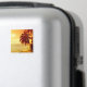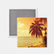 Imán fotográfico de recuerdo de palmeras en una playa en una isla tropical en el océano pacífico al atardecer.