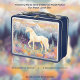 La metalizado lona "Palomino Horse Chicas" Floral Pastel Fun es perfecta para los adolescentes y preadolescentes que adoran los caballos y la belleza de la naturaleza. Con un majestuoso caballo palomino rodeado de extravagantes flores silvestres, los tonos rosa pastel, azul y violeta crean una atmósfera alegre y serena. El diseño capta la esencia de las aventuras al aire libre y el amor por los amigos equinos, haciendo que el almuerzo se sienta como una aventura. Personalízalo con un nombre para hacer de esta lonchera verdaderamente única y especial para cualquier chica amante del caballo.