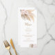 Nuestra tarjeta de menú de cena boda Bohemian Pampas Grass es perfecta para una elegante boda. El moderno diseño rústico de boho presenta románticas flores de color agua en tonos suaves de trigo, malva, rosa y crema blanco con acentos de pasto pampas. Este menú se puede utilizar para la recepción de bodas, la cena de ensayo o cualquier evento.