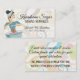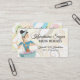 Bonito mujer panadera o cocinar tarjetas de visita para cocinar panadería, pastelería o pastelería. Lleva una camisa azulada y un pañuelo en la cabeza, mezclando un tazón gigante de masa o masa con una cuchara gigante de madera. También hace una excelente etiqueta de regalo o producto para sus pasteles, pasteles, galletas, panes y otros productos horneados.