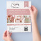 ¡Promueve tu panadería con estilo y dulzura! Este volante de personalizable es perfecto para mostrar tus quequitos, macarones, pasteles y más. Añade tus propias tres fotos para resaltar los mejores vendedores o los tratamientos de firma, y personaliza el texto con tus iniciales, nombre, información de contacto y etiqueta. Una sección dedicada para un código QR facilita a los clientes el escaneo, pedido o seguimiento en línea. Ideal para panaderías, pastelería, pastelería y postres que buscan compartir su marca de una manera hermosa y profesional.