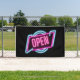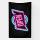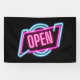 Banner al aire libre de neón divertido para negocios, eventos, puestos de concesión, y más. El diseño presenta un marco de neón de estilo retro con texto diagonal "abierto" sobre fondo negro.