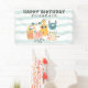 Pequeños monstruitos coloridos y graciosos en esta gran pancarta para desear a tu pequeño monstruo un cumpleaños feliz. Alegres monstruos rosas, verdes, azules y dorados con caras divertidas y amigables.