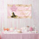 Banner de la fiesta de cumpleaños de zapatos de tacón alto rosado y dorado con globos rosados de bonito, zapatos de tacón altos y perlas en un fondo de remolino rosado de satén. Este hermoso banner de fiesta de cumpleaños rosa y dorado se personaliza fácilmente con el texto de su elección. Se trata de un diseño impreso sin satén, purpurina, perlas, etc.