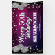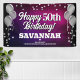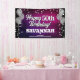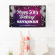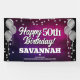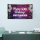 Cartel de pancartas divertidas en interiores o exteriores, con globos metálicos plateados festivos a ambos lados del diseño con confeti metálico brillante y plateado sobre un fondo color rosa y morado caliente rico en textura para tu banner de cumpleaños personalizado. Este producto se duplica como un maravilloso recuerdo de cumpleaños.