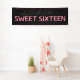 Banner de la fiesta de cumpleaños 16 de Girly con fondo negro de moda, brillantes y confeti purpurina rosado, elegantes globos de hellio dulces dieciséis de color rosa y nombre de los chicas de cumpleaños.