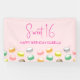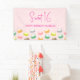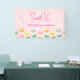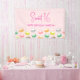 Dulces y encantadores macarones en una moderna pancarta rosa para una dulce fiesta de 16 años.