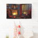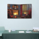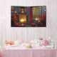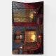 Un acogedor rincón de lectura en un día lluvioso de otoño. Alrededor de la chimenea hay unos sillones rojos mullidos, con pilas de libros y tartas y una tetera para completar el confort. En el exterior, un sauce amarillo y una cubierta roja de arce y hayas se ven oscurecidos por la lluvia que sopla la ventana, donde un gato jengibre se sienta mirando hacia afuera.