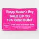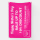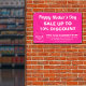 ¡Feliz Día de la Madre! Festividad para celebrar la maternidad. Banner de personalizable con la venta del Día de la Madre, su nombre comercial y otra información. Cartel que se puede usar como material de marketing para atraer más clientes. Personalizar y úselo para convencer a más clientes de que compren sus productos o clientes para que les gusten sus servicios este Día de la Madre. Los colores de diseño y la forma son textos blancos sobre fondo rosa y forma rectangular de formato paisajístico. Los contenidos son textos de bienvenida del Día de la Madre Feliz, textos de venta, porcentaje de descuento que ofrecerás, fechas de venta, tu nombre de negocio, logotipo, dirección, número de teléfono, correo electrónico y sitio web o tu página de medios sociales. Compruebe la apariencia después de cargar el logotipo y escribir textos. Si la apariencia le resulta agradable, puede realizar su pedido ahora. Si necesita cambiar el tamaño y mover el logotipo y los textos para que encajen en este cartel, por favor cambie la herramienta de diseño. También puede realizar otros cambios en la herramienta de diseño según el aspecto de este cartel que prefiera, como cambiar el color de fondo, el color de la fuente y el estilo de fuente. ¡Feliz Día de la Madre! Te deseo más ventas esta fiesta.