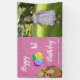 Bebé niña pequeña Lechuza rosa con globos usando un Gorra colorido, cartel de feliz primer cumpleaños.