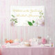 Banner moderno, ventilado y elegante de fondo blanco acogedor que celebra a la futura novia. Personaliza con el nombre de la futura novia y el personalizar con el tipo de evento. El diseño presenta un par de arreglos florales de esquina de flores blandas, blancas y rosas, y botánicos verdes, todo decorado con una delgada línea dorada. Es elegante, delicado y elegante.