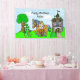 La pequeña rubia cabello de príncipe con corona y espada, y su caballo mascota, dragón y rana con un castillo y árbol con un búho en el fondo, pancarta personalizada de cumpleaños.