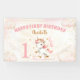 Primer y cualquier banner de la fiesta de cumpleaños con un lindo unicornio feliz, globos, estrellas doradas y nubes en suaves tonos rosa y beige. Diseño lindo para el primer cumpleaños o cualquier cumpleaños de una niña pequeña. Personalice fácilmente todo el texto, incluido el número de cumpleaños. - Kate Eden Art