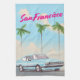 Afiche del estilo de San Francisco California Vintage de USA Travel de 1980 de un auto deportivo estilo 1980 con un fondo de atardecer tropical.
