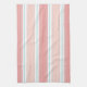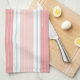 Una toalla de cocina bonita en bandas preciosas del color en sombras suaves de la playa del trullo descolorado del coral y de la luz, en un fondo de la patata a la inglesa, blanco limpio. Muy tranquilo. Coordenadas perfectamente con nuestras esteras de lugar, servilletas, almohadas, y prácticos de costa a juego.