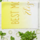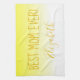 Diseño de toallas de cocina amarillo oscuro brillante, con la leyenda "Mejor Mamá de la Historia" escrita con una fuente dorada sobre un fondo oscuro amarillo. Una plantilla para insertar un nombre en una bonita fuente cursiva está justo debajo. ¡Pide tu toalla de cocina hoy!