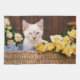 Esta linda foto de Getty Images muestra a un gatito sentado en una canasta con rosas amarillas.
