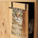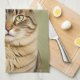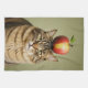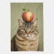 Un gato gracioso con una manzana balanceándose encima de su cabeza.