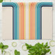 Ilustracion de estilo retro con arcos coloridos (amarillo, azul, naranja, azul marino, beige, turquesa) sobre fondo beige. Puede agregar su nombre/monograma para personalizar el elemento.