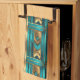 This kitchen towel features an art deco style geometric pattern in simulated gold and turquoise.