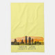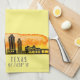 Elegante toalla de cocina con silueta de línea de horizonte de la ciudad de Austin Texas con salpicaduras de color de agua al atardecer y coordenadas de mapa de latitud y longitud