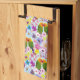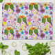 Dos pájaros amorosos juntos en una rotura de árbol con flores rosas, amarillas, blancas y violetas alrededor de ellos en un fondo azul