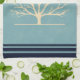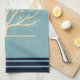 Una toalla de cocina con fondo verde y mudo sobre la superficie es un árbol amarillo claro con dos siluetas de pájaro naranjas sentadas sobre las ramas.